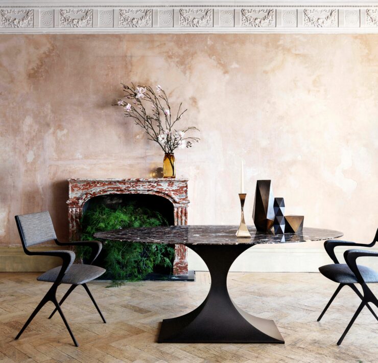 Sarreid Ltd. built on the success of its round Jupe extension dining tables with the Italian-made Cambiare model introduced in the fall. Before expansion, the table seats six but when fully extended to about 99 inches by 55 inches, it seats 12 comfortably.