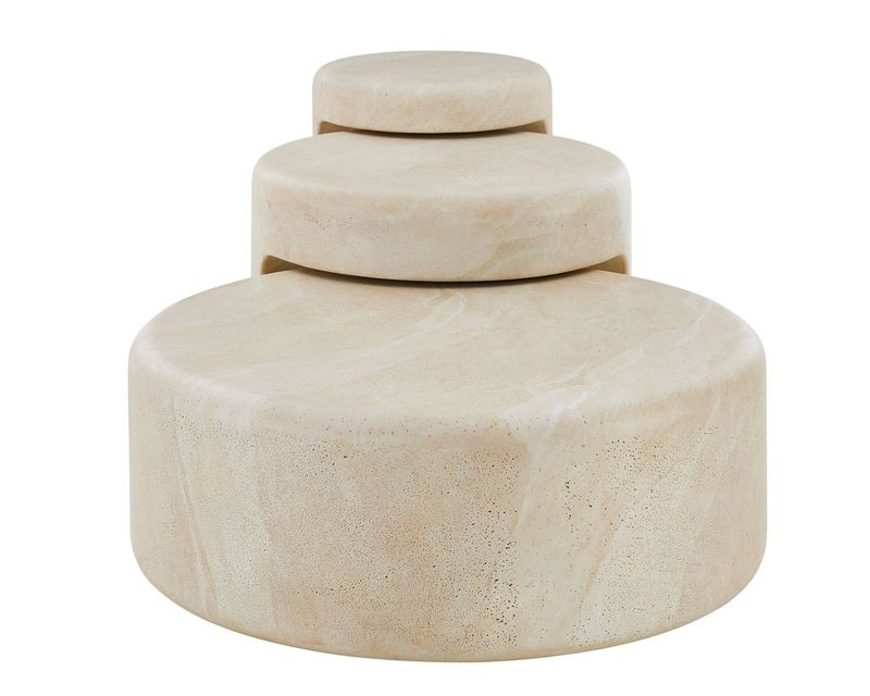 Universal Furniture’s Nimbus nesting tables are part of the Mist & Veil extension to the company’s Modern line. The trio is made of fiberglass-reinforced concrete with a hydrographic finish that imitates travertine marble. The tables can be used indoors or outdoors.