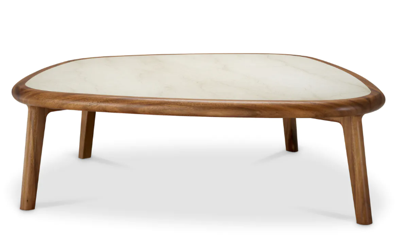 The Wilma coffee table from Eichholtz features a marble top with subtle veining and sturdy mahogany wooden base and feet in a Caramel finish. It’s also available as a side table.