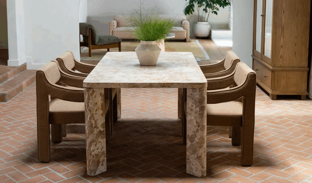 Moe’s Home Collection describes its new Segment dining table as “bold but grounded, sculptural but easy to live with.” A combination of contrasting angles and curves, the table is topped with Panther stone, with veining that makes each table one of a kind. It’s shown here in Beige and is also available in an all-wood version in a Heritage Brown finish.