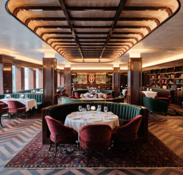 In the Manon dining table from Four Hands, a simply shaped, bullnose-edged top sits upon a pedestal base that recalls rolling waves. The cast aluminum table is finished in a glossy black to interact with light from every angle.