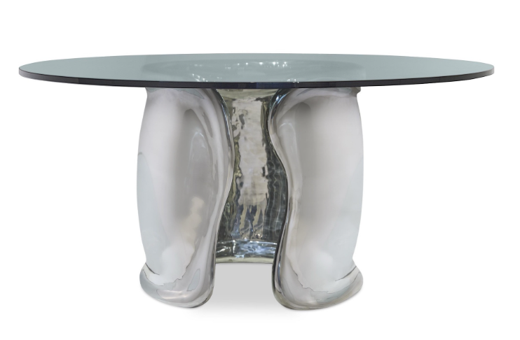 The Agnes dining table from Bernhardt Furniture Co. is a jewel, with a base of stainless steel sculpted into a cuff and polished to a gleam. A round glass top allows a view into the dramatic base.