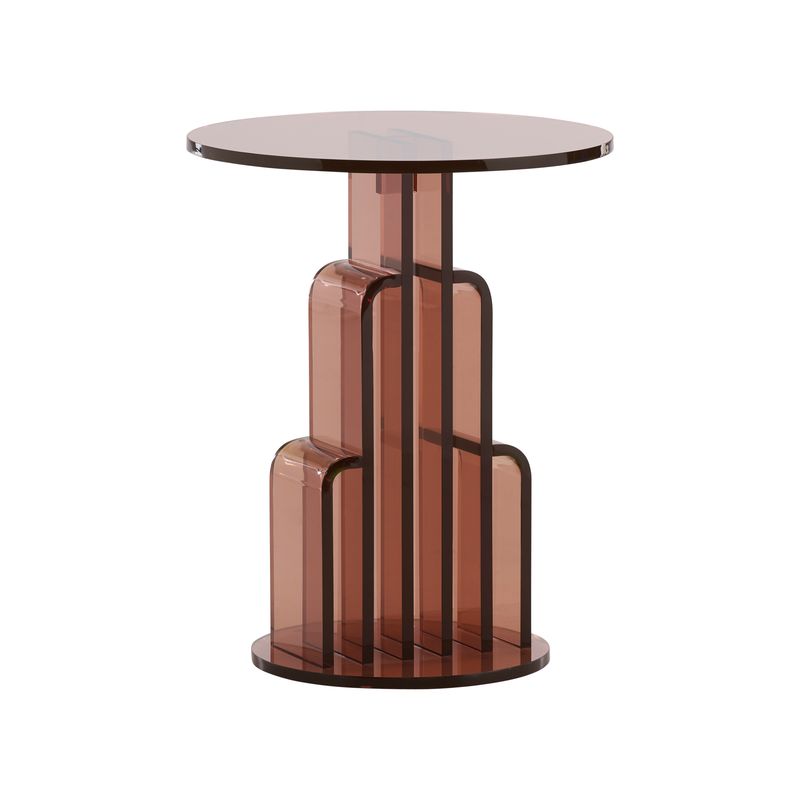 The acrylic Aubrielle side table from Wildwood, shown here in Hazel Brown, is also available in Clear and Azure Blue.