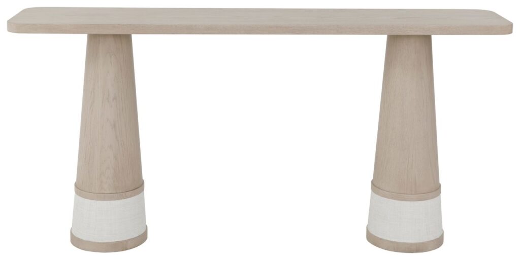 This console table is part of the new 23-piece Marbella collection of occasional, bedroom and dining offerings from Fairfield. With a modern coastal sensibility, Marbella pieces are made of solid oaks and veneers. Finishes include Pebble and a washed Sea Salt.