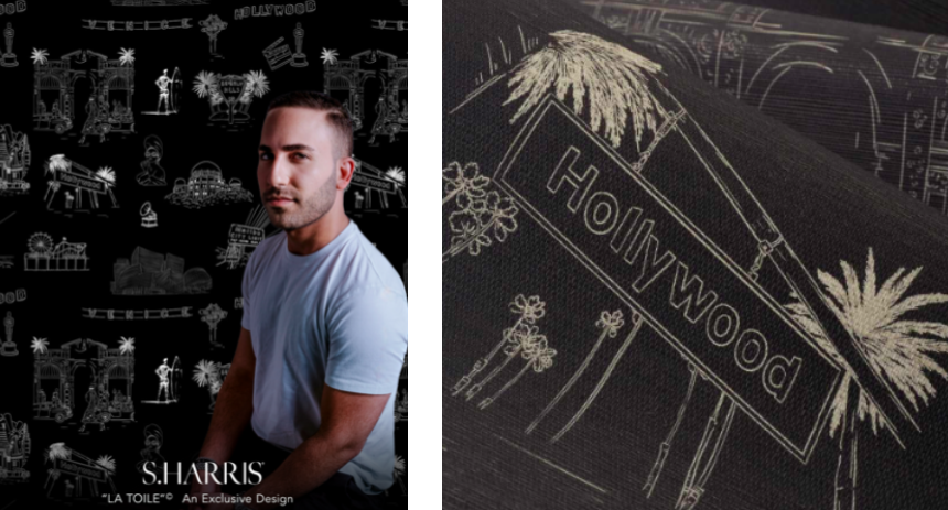 For the S. Harris toile, Saghian features nods to LA like the Hollywood sign, the Frank Gehry designed Walt Disney Concert Hall, an Oscar, the Griffith Observatory, and what Saghian calls “a glam girl getting on her makeup.” After all, he notes, “I’m born and raised in Los Angeles, one of the world’s coolest cities, and had fun featuring all these iconic landmarks I grew up around.”