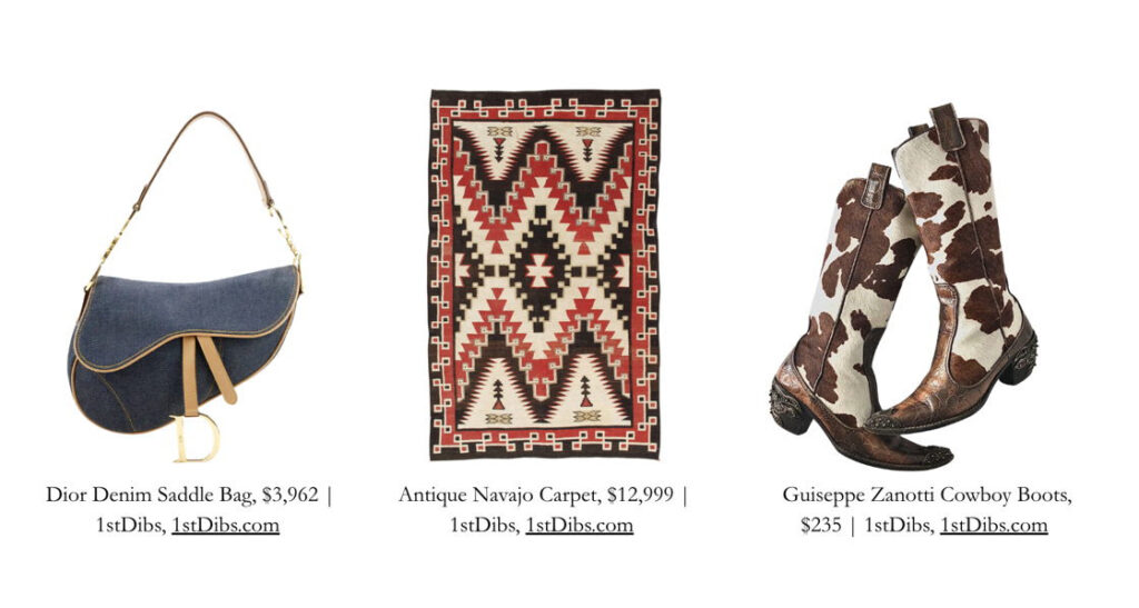 2025 brought a renewed interest in Western-influenced art, fashion, and design, with an emphasis on Americana-inflected pieces, turquoise-forward jewelry, and pieces crafted by the indigenous peoples of the Americas. As Beyoncé kicked off her ‘Cowboy Carter’ tour, 1stDibs collectors showed a similar affinity for Western-inspired style. Searches and purchases spotlighted cowboy boots, saddle bags, and horsebit loafers, reflecting a broader desire for classic American aesthetics. “Cowboy boots” ranked within the top-forty shoe search terms, while searches for Dior vintage saddle bags spiked 104% in Q1. Equestrian motifs also showed up in trending art; “horse painting” came in as the fifth most popular painting-related search term, and “Remington bronze sculpture” ranked in the top-ten sculpture-related searches.